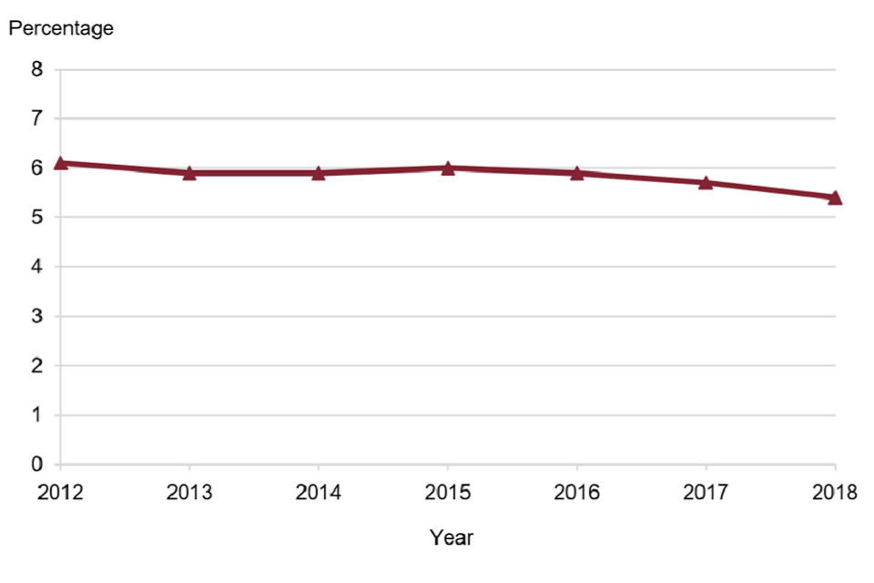 In 2018, 5.4% of the population aged 16 and 64 years were claiming ESA, Incapacity Benefit (IB) or Severe Disablement Allowance (SDA) in England, down from 5.7% in 2017 (Figure 4).