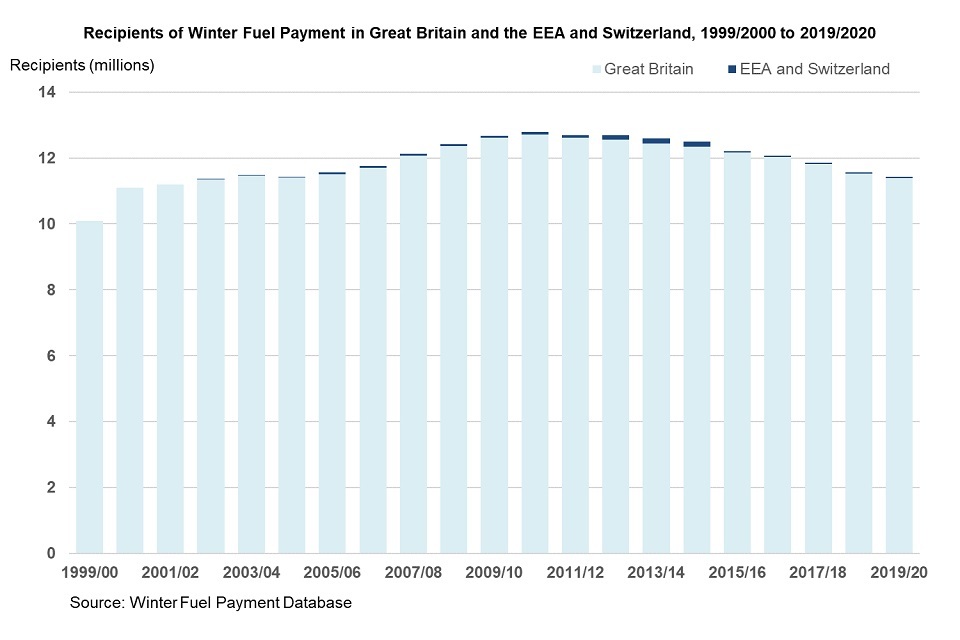 - 11.4 million people received Winter Fuel Payment in winter 2019 to 2020, a drop of 180,000 since winter 2018 to 2019: