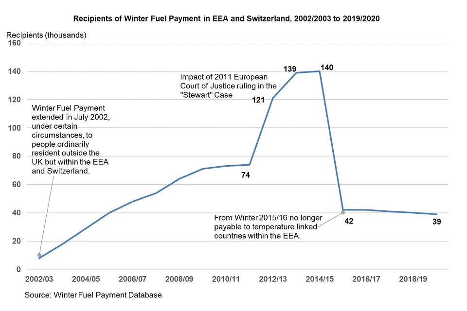 The sharp rise followed a 2011 European Court of Justice ruling in the “Stewart” Case that meant, as of winter 2012 to 2013, people who live in another EEA country or Switzerland and have a genuine and sufficient link to the UK (for example, that the person has lived or worked in the UK for the majority of their working life), are potentially eligible to receive a Winter Fuel Payment, regardless of whether they previously had entitlement to it whilst living in the UK.