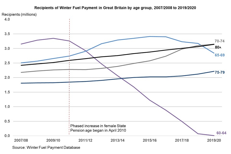 Under current legislation, State Pension age for women equalised with State Pension age for men at 65 years in 2018. This has seen the number of people aged 65 to 69 receiving Winter Fuel Payment decrease by 340,000 people, to 2.8 million people in winter 2019 to 2020. All the older age groups have increased in size between winter 2018 to 2019 and winter 2019 to 2020.