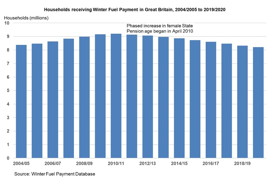 Following an increase in the number of households in Great Britain in receipt of Winter Fuel Payment from winter 2004 to 2005 and winter 2010 to 2011, the numbers have gradually declined. As with the recipient figures, this decrease is due to the rise in women’s State Pension age since April 2010. The general increase in the number of pensioners has been off-set by the gradual increase in the women’s State Pension age and, therefore, the age of entitlement for Winter Fuel Payment.