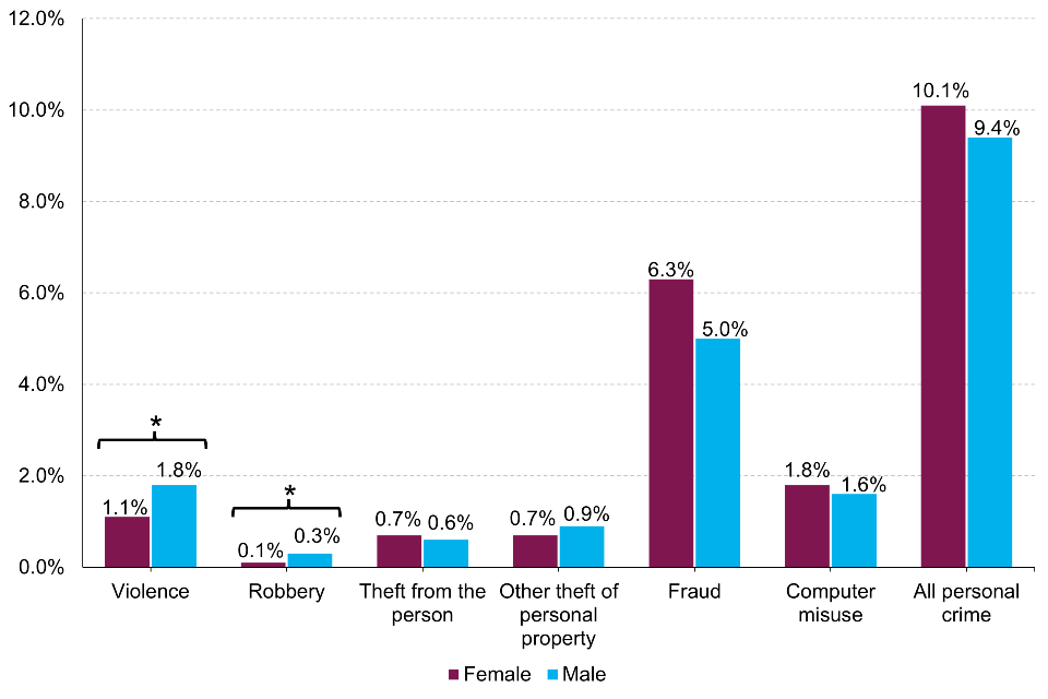 | In 2022/23 the CSEW estimates that females are significantly more likely to be victims of headline crime than males. | Excluding fraud and computer misuse, females were significantly less likely of being a victim of personal crime than males. |