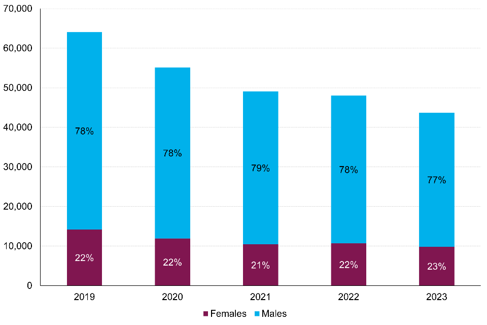 | In 2023, 22% of individuals dealt with by the Criminal Justice System were female, and 78% were male. | The proportion of females dealt with has decreased from 27% in 2019 to 22% in 2023. This is likely a result of the COVID-19 pandemic and restrictions placed on criminal courts as a result. |