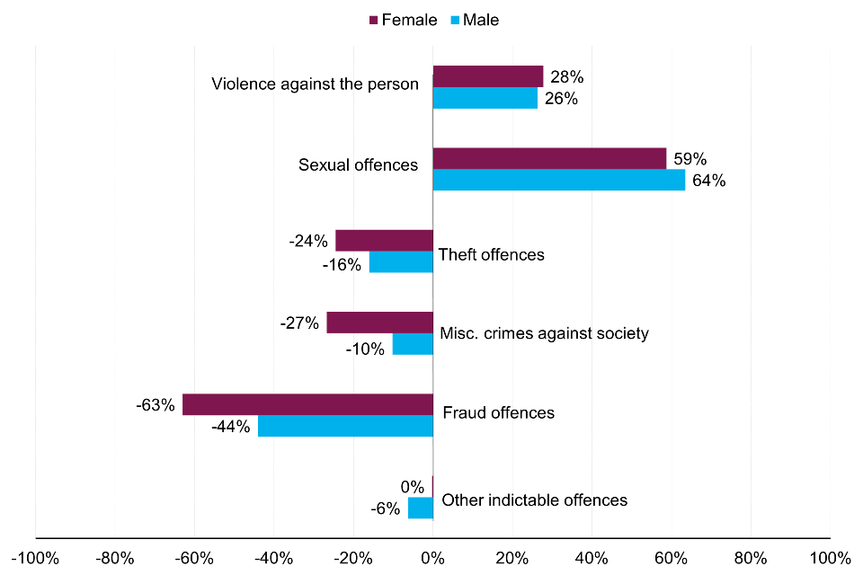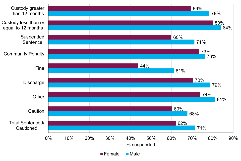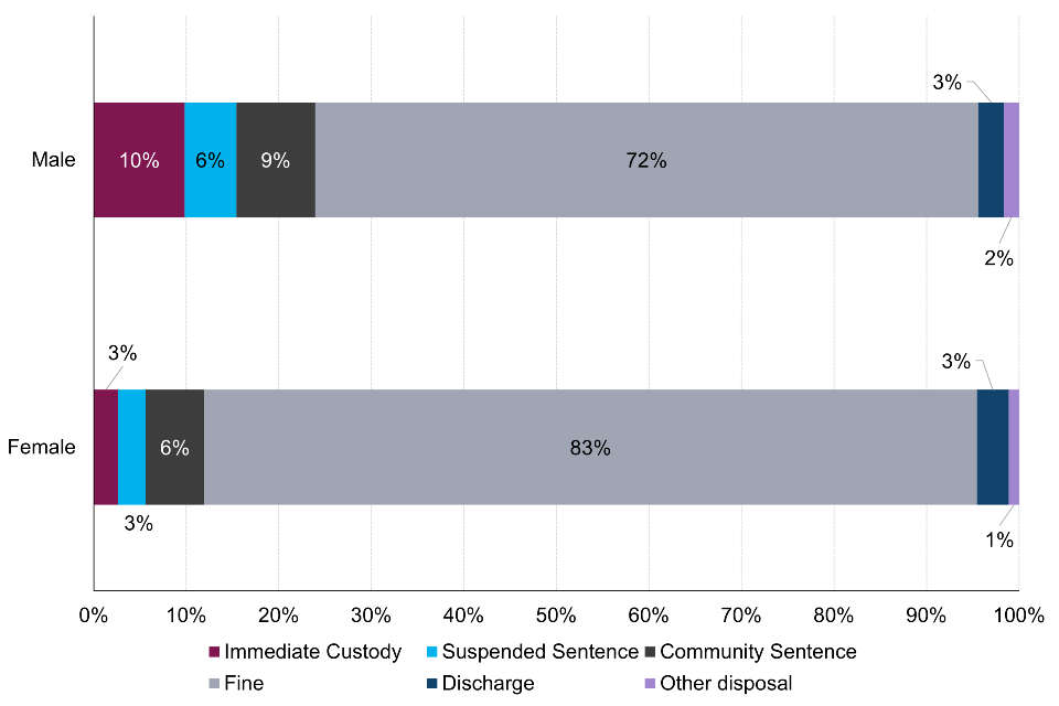 In general, females appear to be substantially underrepresented throughout the CJS compared with males. This is particularly true in relation to the most serious offence types and sentences, though patterns by sex vary between individual offences.
