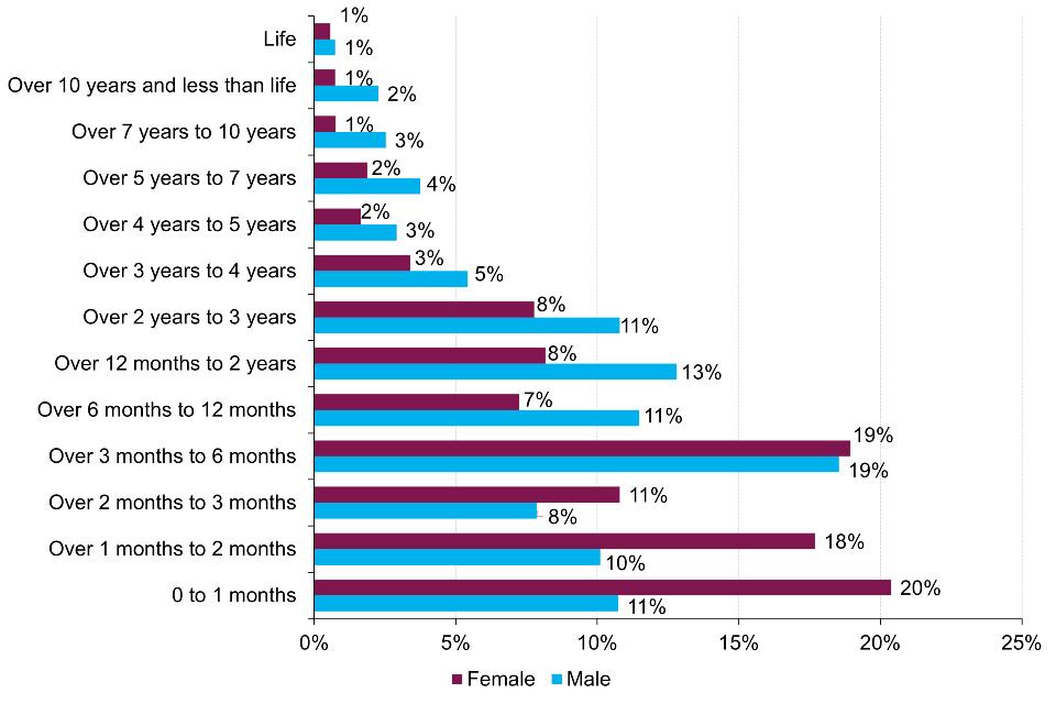 | Females were serving shorter custodial sentence lengths. | As at 30 June 2024, 16% of females and 4% of males were serving sentences of less than 12 months. |