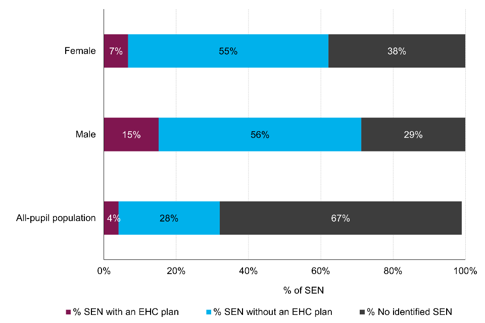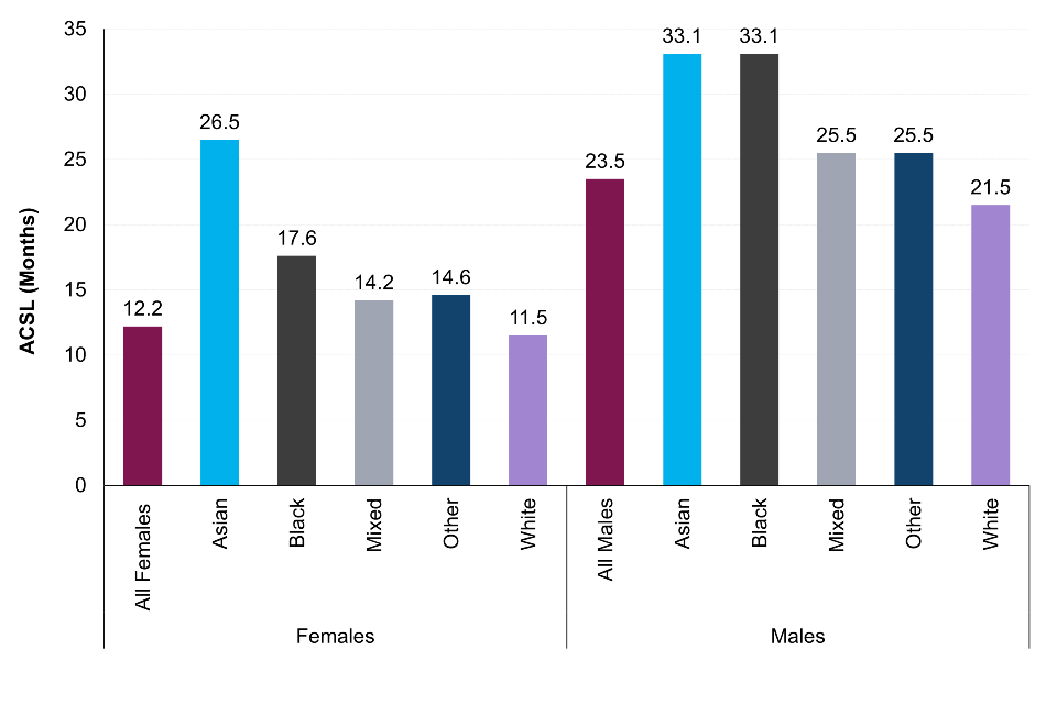 A 5-year time series’ have been presented wherever possible, of whichever length is most appropriate in context. There are few comparisons to the population as a whole, but we have considered this to be 51% female, as based on population and household estimates from the Office for National Statistics 2021 census data.