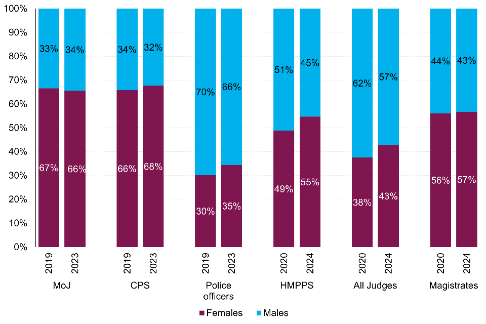 | Over the last 5 years, there have been increases in female representation across almost all CJS organisations and in the proportion of senior staff. | The largest increase in female representation was seen in HMPPS staff, from 49% in 2020 to 55% in 2024. |
