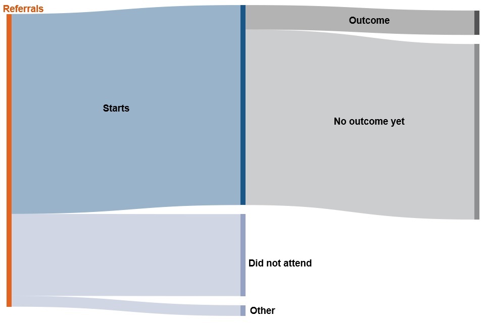 Overall, up until August 2019, the national proportion of starts to individuals referred is around 76%. Due to differences when each area began offering services and respective sizes, these figures vary across areas. However cumulatively, the highest rate of individuals referred to starts is in Wales and the Home Counties (80%) and the lowest rate of individuals referred to starts is in Central London (65%).