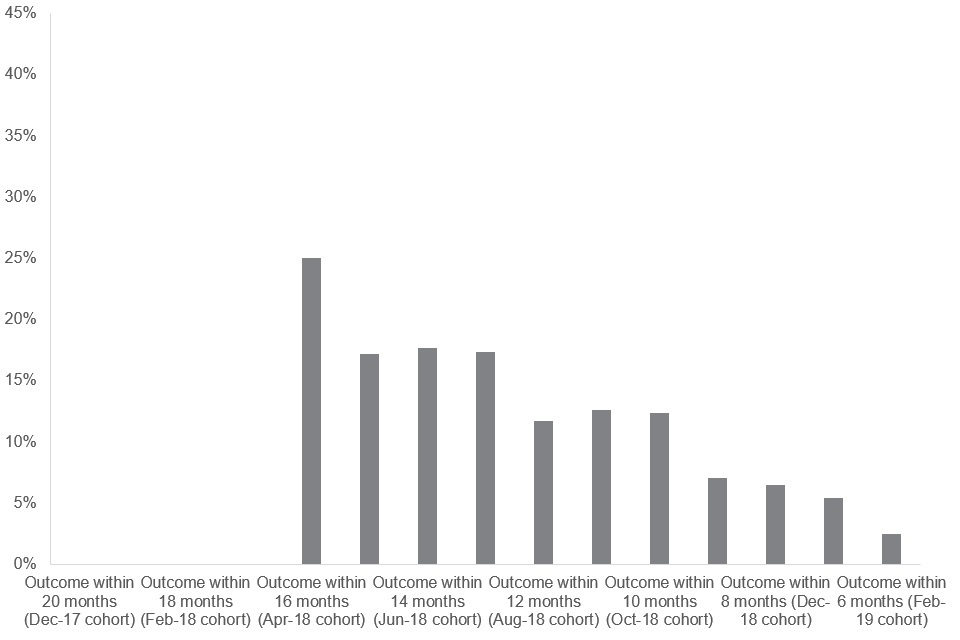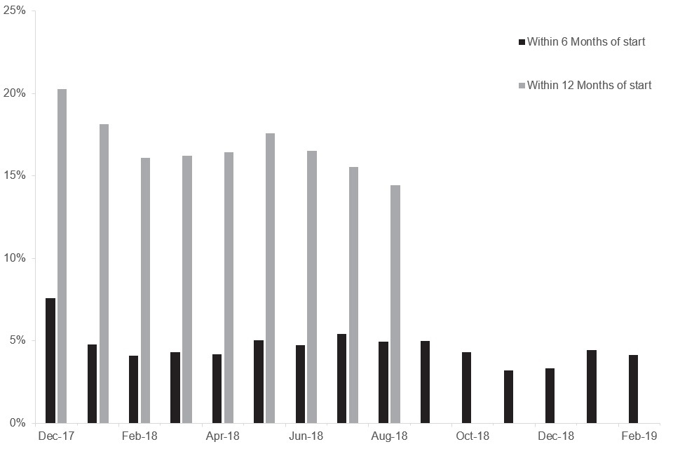 Figure 6.2: Total job outcomes as a percentage of starts by month started, cohorts from December 2017 to February 2019