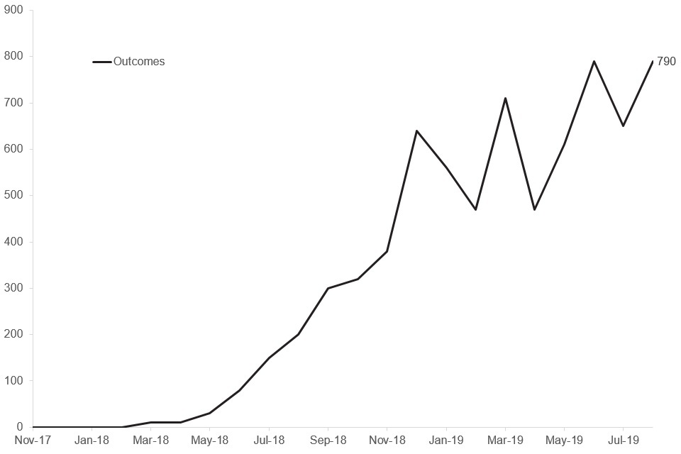 7,150 participants have reached the job outcome earnings threshold or reached 6 months of being in self-employment as of August 2019. March 2018 saw the first participants reach the job outcomes earnings threshold or 6 months of being in self-employment