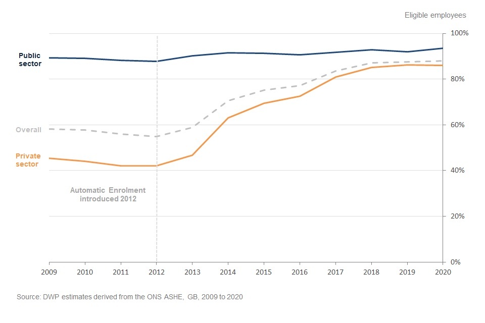 Overall 88% of eligible employees (19.4 million) were participating in a workplace pension in 2020. Overall trends in participation have increased since 2012, driven by the private sector while public sector participation has remained high.