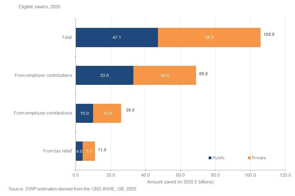 Overall in 2020, contributions by employees accounted for 25% of saving, with employer contributions accounting for 65%, and income tax relief on the employee contribution the remaining 10%.