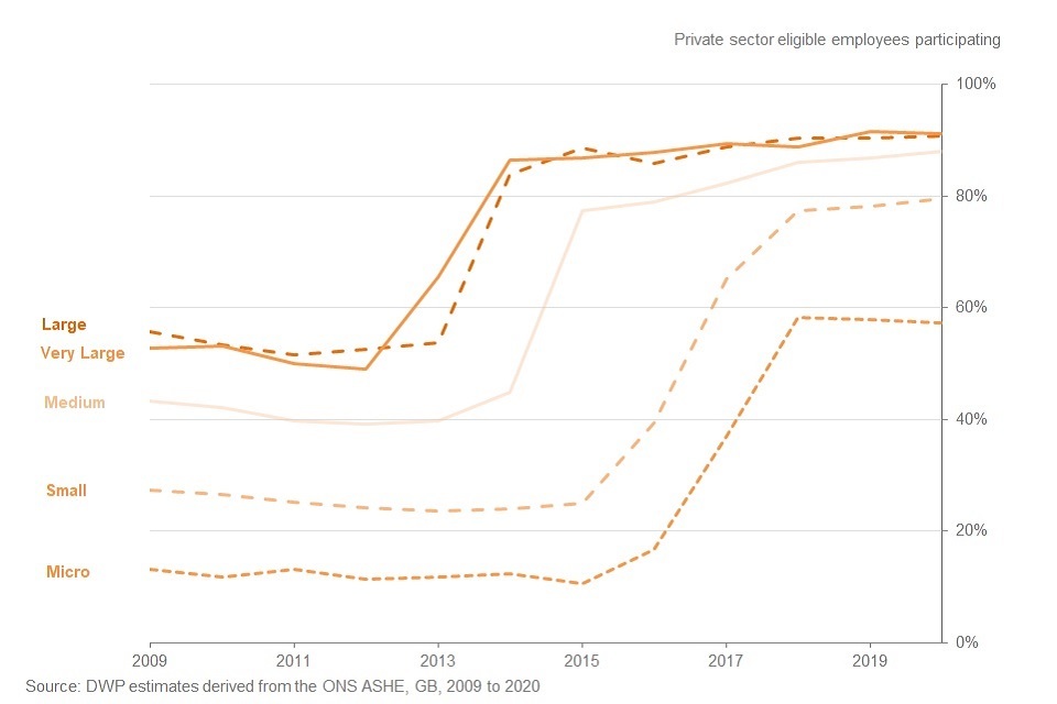 After large increases since 2012, participation rates in the private sector have stabilised for each employer size band but persistent gaps remain for small and micro employers.