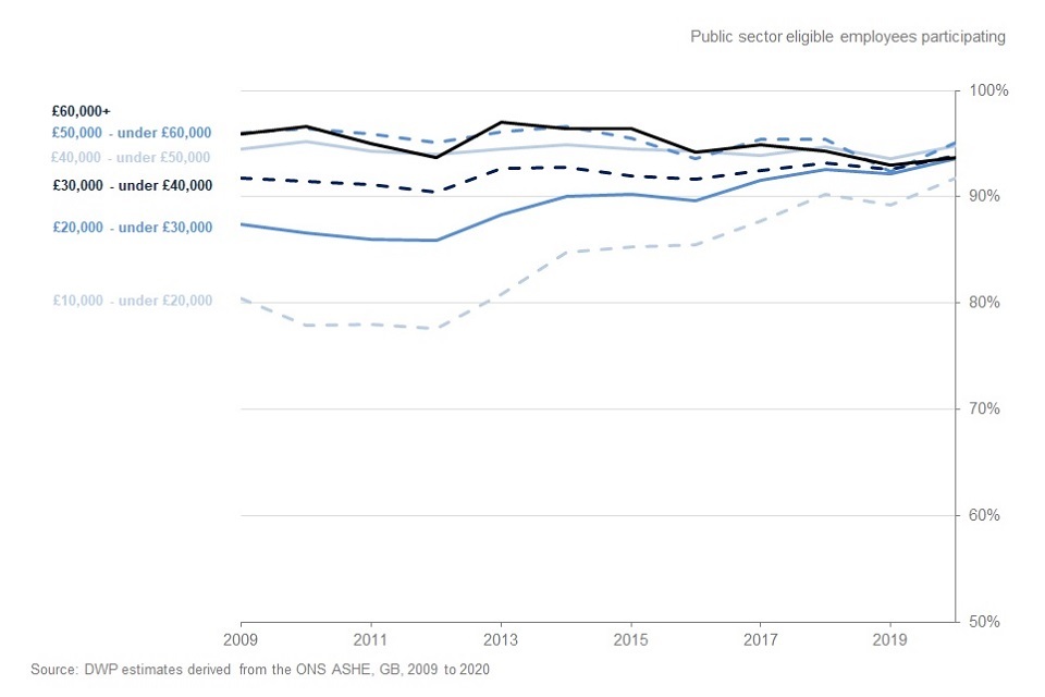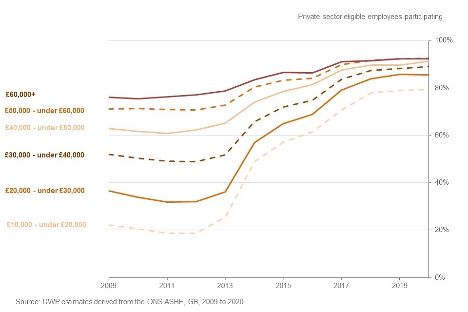 Across the whole economy those earning between £50,000 and £60,000 show the highest participation levels. In 2020, 93% of eligible employees within this earnings band were participating in a workplace pension.