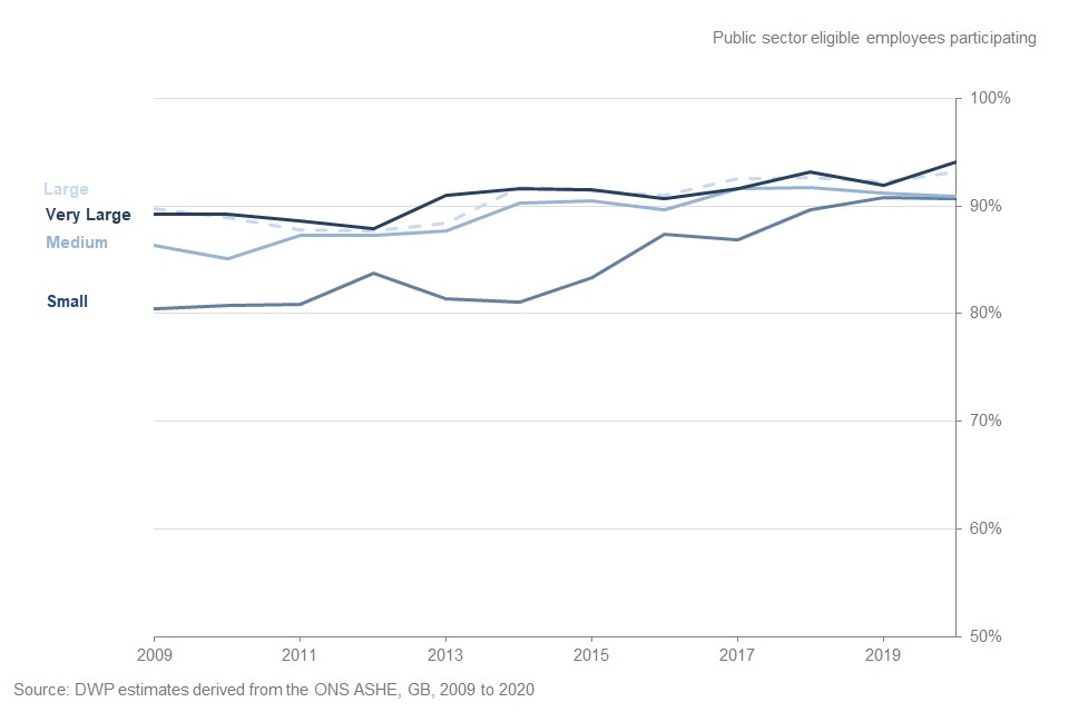 The highest levels of both private and public sector participation in 2020 were seen in the larger employer bands. In the private sector, 91% of eligible employees were participating in the large (250 to 4,999) and very large employer bands (5000+ employees). In the public sector, participation rates of eligible employees in large and very large employer bands were 93 and 94% respectively.