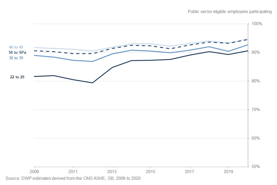 Participation rates in the public sector remain high and broadly stable since 2014. Despite narrowing after 2012, there is a small but persistent gap between the youngest and oldest age groups of 4 percentage points.