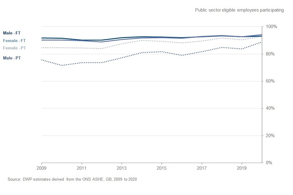 In the public sector overall participation rates for both male and female eligible employees have remained stable, and were 93 and 94% respectively in 2020. Among full-time employees in the public sector, there was only a 1 percentage point difference between male and female employees (93 vs 94% ), while among part-time employees, the participation rate has remained persistently higher for female than male employees (93 and 89% respectively in 2020).