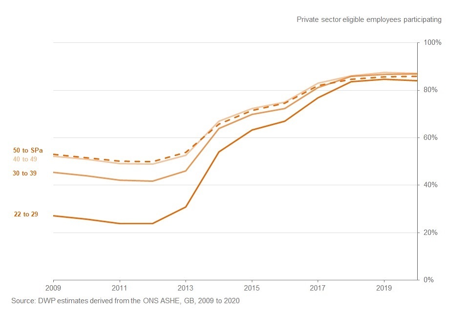 Across the whole economy participation rates for eligible employees in 2020 are highest for the 40 to 49 age group (89%) and lowest for the 22 to 29 age group (85%).