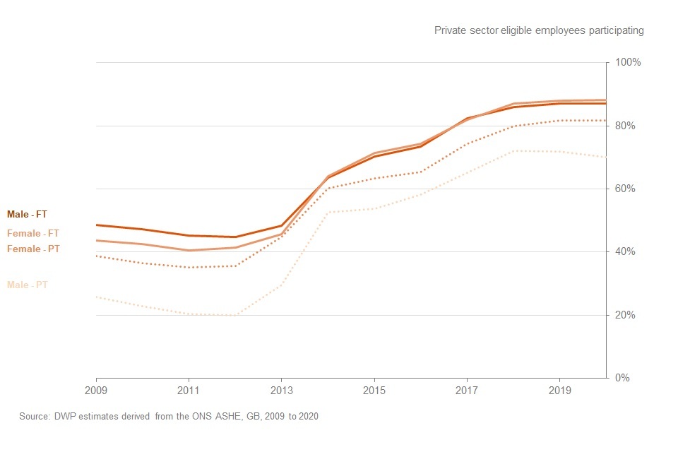 In the private sector overall participation rates for both male and female eligible employees were 86% in 2020, compared to 2012 when the participation rate for male employees was three percentage points higher (43% compared to 40% for female employees). The same trend of a narrowing gender gap since 2012 is seen among full-time employees in the private sector, and in 2020 the participation rate for female full-time employees (88%) was slightly higher than for male full-time employees (87%). Among part-time employees the participation rate has remained persistently higher for female than male employees (82% and 70% respectively in 2020), although the rates for both genders have increased greatly since 2012.