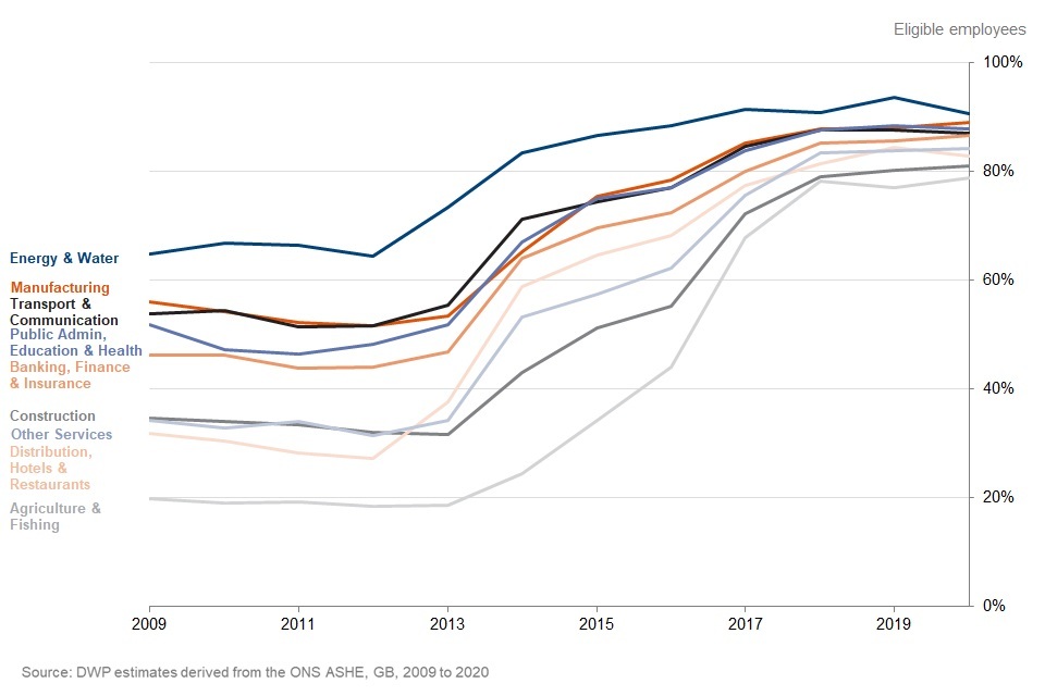 In the private sector all industries have seen increases in participation since 2012, and the gap between different industries has narrowed. The industry seeing the largest increase in participation since 2012 is the Agriculture & Fishing industry, which saw an increase of 60 percentage points.