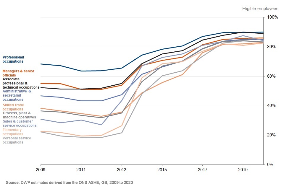 Since 2012, all occupations in the private sector have seen a large increase and the gap in participation between different occupations has narrowed. The largest increase could be seen in Personal Service occupations where the participation rate increased by 65 percentage points from 19% in 2012 to 83% in 2019.