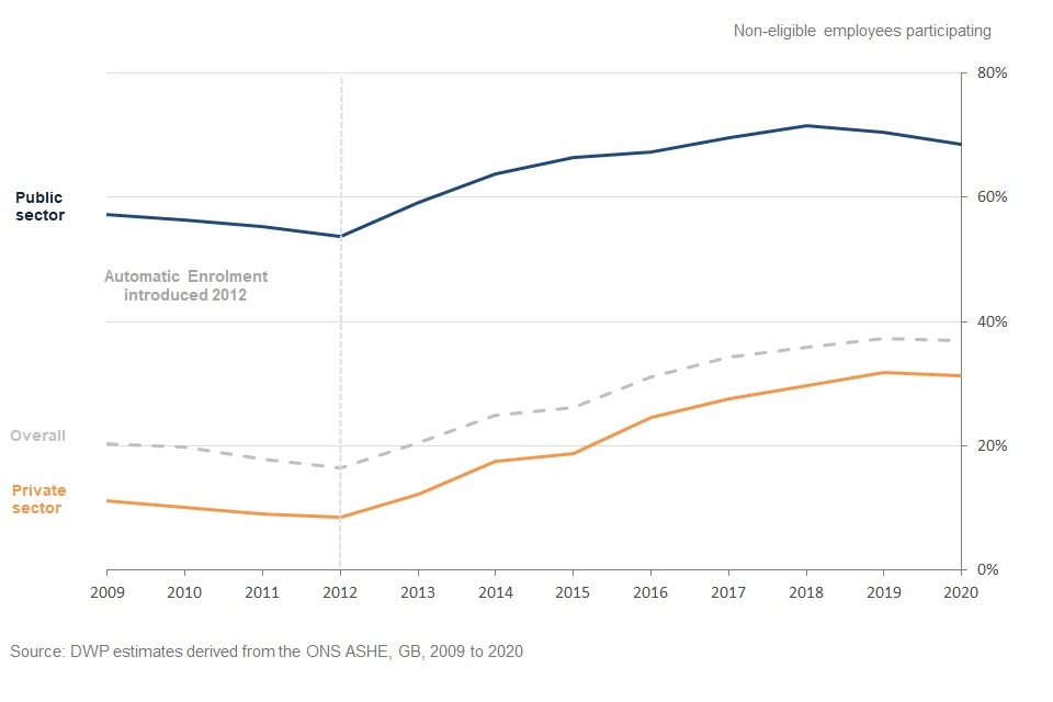 Public sector pension participation remains relatively high at 68.6% in 2020 (0.6 million non-eligible public sector employees), an increase of 14.9 percentage points since 2012.