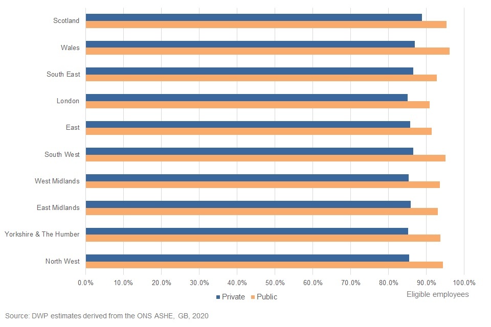 In the private sector in 2020, the highest participation was in Scotland at 89% of eligible employees. The lowest, at 85%, was London.