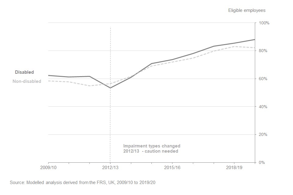 In 2019 to 2020 there was gap in participation between these groups which widened to 6 percentage points with 88% of disabled eligible employees participating compared to 82% of non-disabled eligible employees, compared to a participation gap of 2 percentage points in 2018 to 2019.