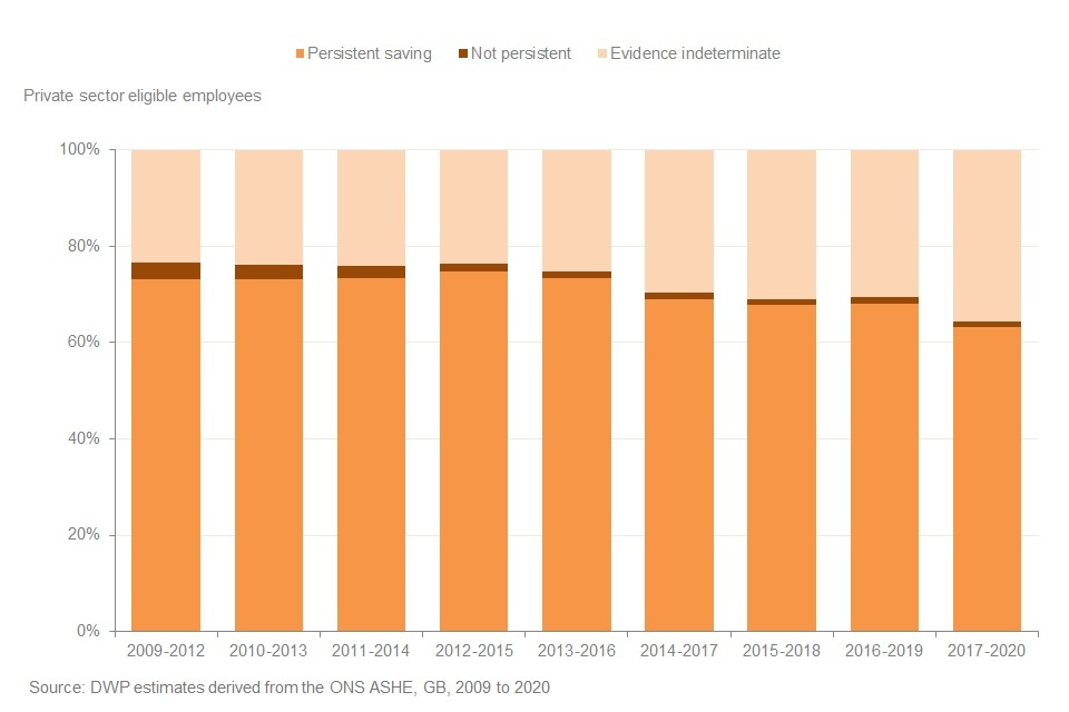 Overall 65% of eligible savers in 2017 to 2020 were saving in at least two of the following three years. One percent of eligible savers were not saving persistently and for the remaining 34% there is indeterminate evidence.