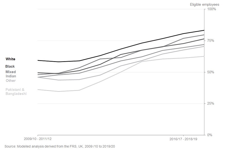 Eligible employee participation continues to increase across all ethnic groups but the gap between White and Pakistani and Bangladeshi groups persist, currently 20 percentage points.