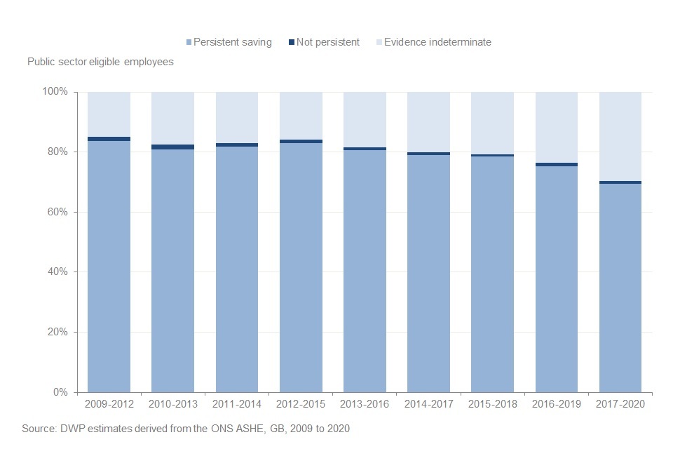 The proportion of eligible savers saving persistently in both the public and private sector has declined over time. The evidence indeterminate proportion has increased since 2012 in both sectors.