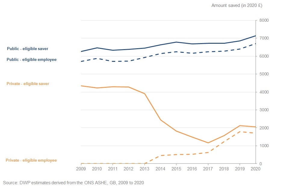The annual total amount saved for eligible savers across both sectors stands at £105.9 billion in 2020, which is an increase of £5.5 billion from 2019. Amounts saved in the public sector increased by £5.7 billion and decreased by £0.2 billion in the private sector.