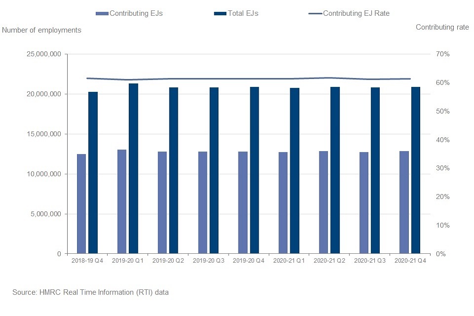 Contributing eligible jobholders to financial year 2020 to 2021 Q4 (Jan to Mar)