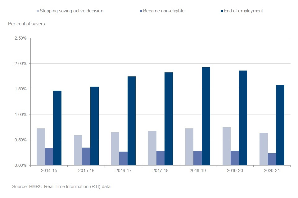 In the financial year 2020 to 2021, the overall stopping saving level has decreased, mainly driven by a fall in those stopping saving due to ending their employment, which fell from 1.9% to 1.6%.