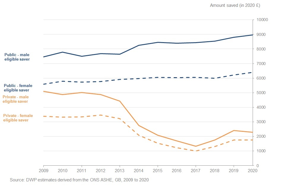 Within the public sector, the average amount saved per male and female eligible savers increased in 2020, by £161 and £189 respectively.