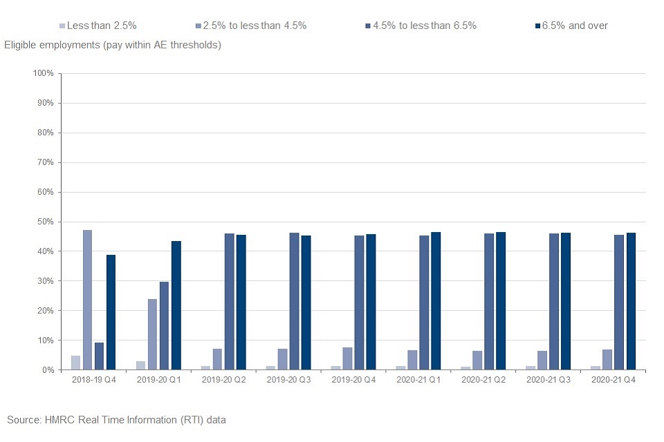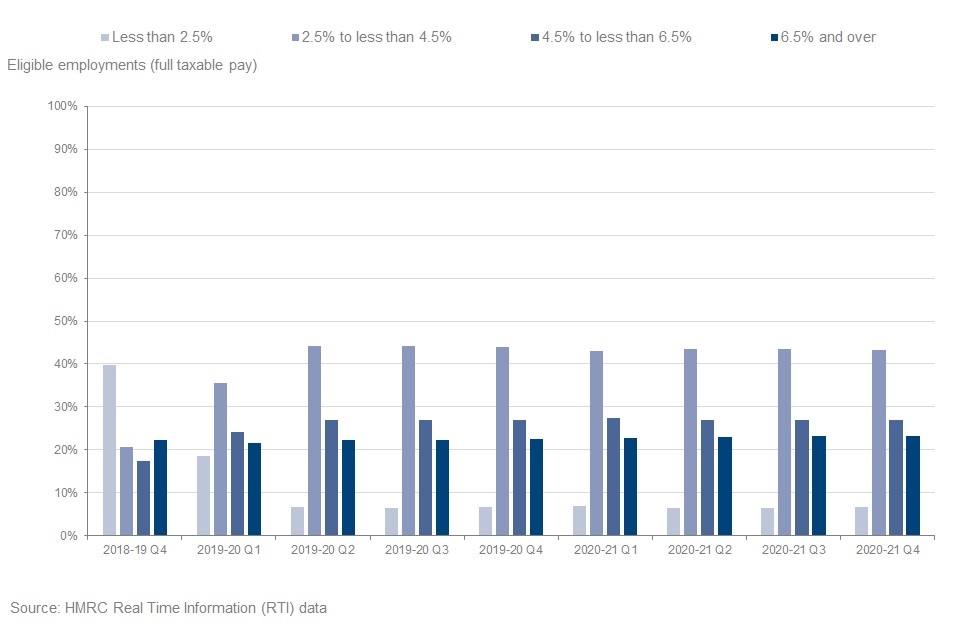 Not all PAYE schemes base their pension contribution rates using the automatic enrolment thresholds, so percentage of an employment’s full taxable pay can be used instead. As of the fourth quarter of the financial year 2020 to 2021, 50% of eligible employments with a recorded employee contribution are contributing 4.5% or more of their full taxable pay into their pension.