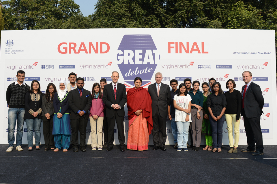 Participants of the GREAT Debate Competition 2015 along with the British High Commissioner to India Sir James Bevan, Smriti Irani Indian Union Minister for Human Resource Development and HRH the Duke of York