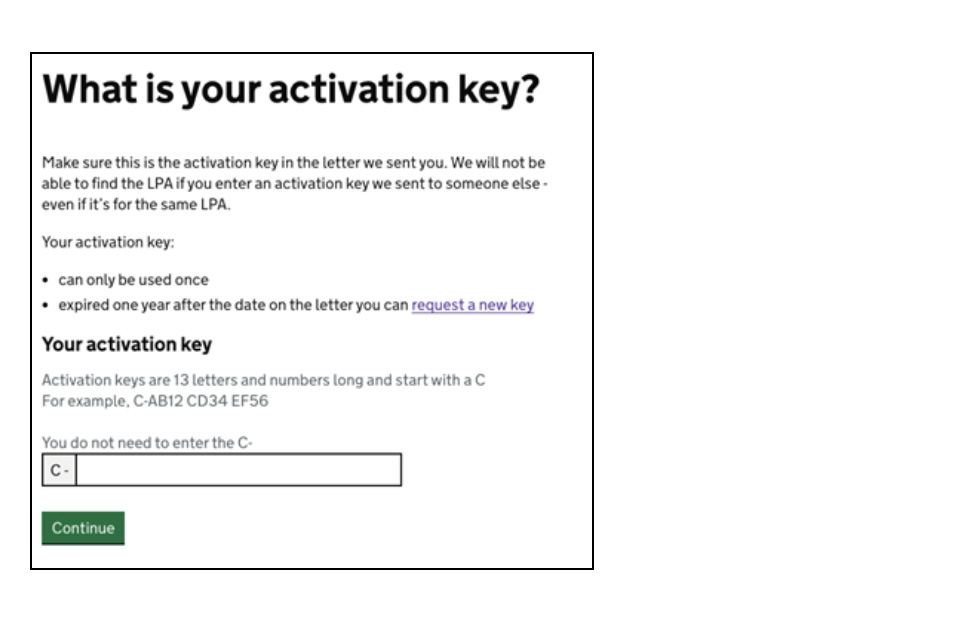 You will be asked if you have an activation key. This is on the letter you were sent confirming the LPA had been registered. If you have the key, select ‘Yes, I have an activation key’ and click Continue.