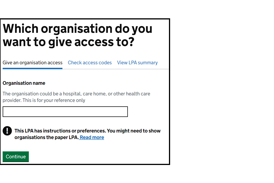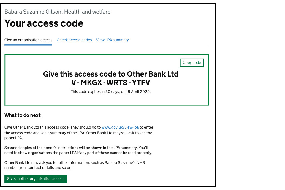 To do this, you must create an access code for the organisation. They will use it on the View an LPA service, to verify you as an attorney and allow you to work with them on the donor’s behalf.
