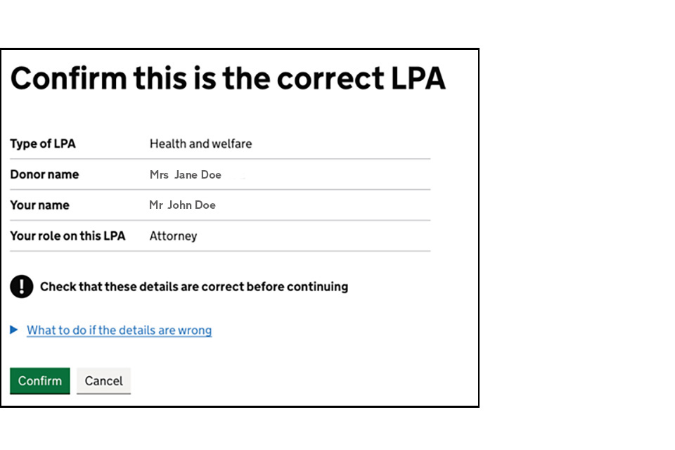 You will be shown a summary of the LPA’s details. Check that this LPA is the one that you intended to add. If it is, click ‘Continue’.
