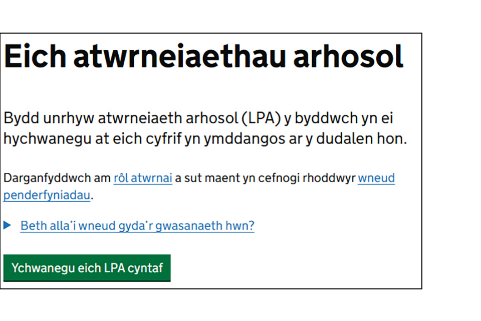 Mae sefydlu cyfrif Defnyddio Atwrneiaeth Arhosol (Defnyddio LPA) yn caniatáu i roddwyr ac atwrneiod gael mynediad i’r LPA ar-lein.