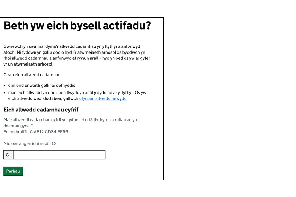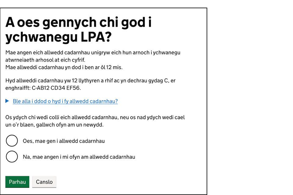 Gofynnir i chi a oes gennych allwedd actifadu. Mae’r allwedd ar y llythyr a anfonwyd atoch yn cadarnhau bod yr LPA wedi’i gofrestru. Os yw’r allwedd gennych, dewiswch ‘Oes, mae gen i allwedd actifadu’ a chlicio Parhau.