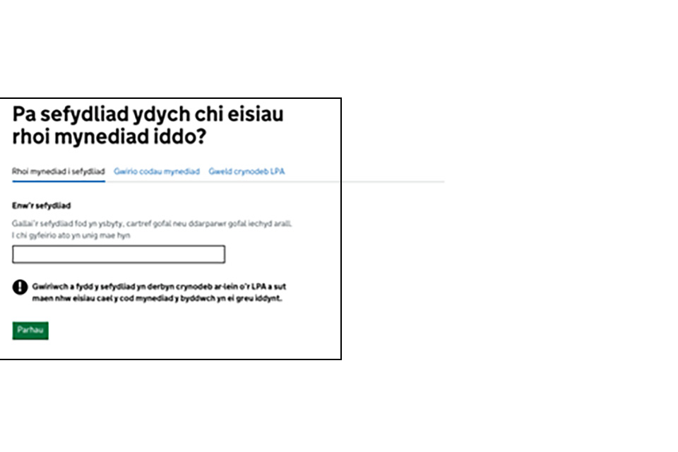 I wneud hyn, rhaid i chi greu cod mynediad ar gyfer y sefydliad. Bydd y sefydliad yn ei ddefnyddio ar y gwasanaeth Gweld LPA, i’ch dilysu chi fel atwrnai ac i ganiatáu i chi weithio gydag ef ar ran y rhoddwr.