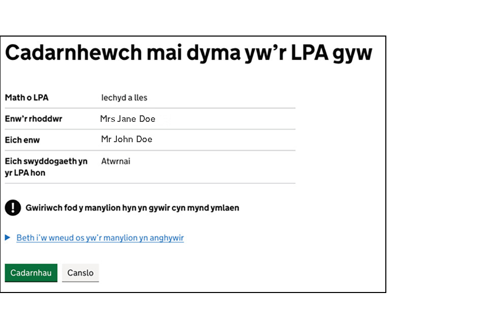 Dangosir crynodeb o fanylion yr LPA i chi. Gwnewch yn siŵr mai’r LPA hwn yw’r un roeddech yn bwriadu ei ychwanegu. Os mai hwn ydyw, cliciwch ‘Cadarnhau’.