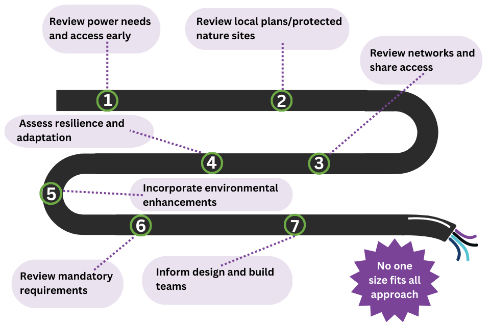 This image illustrates 7 ways to support delivery of digital infrastructure with biodiversity, environmental improvements and net zero considerations at the forefront.