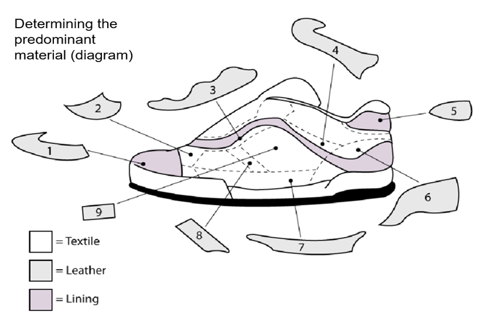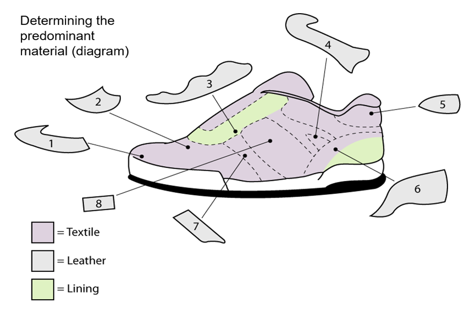 Some shoes are made from a mix of textile, leather and lining material. The upper is determined by the material covering the greatest external surface area. Lining material is not considered to be a material suitable for uppers.