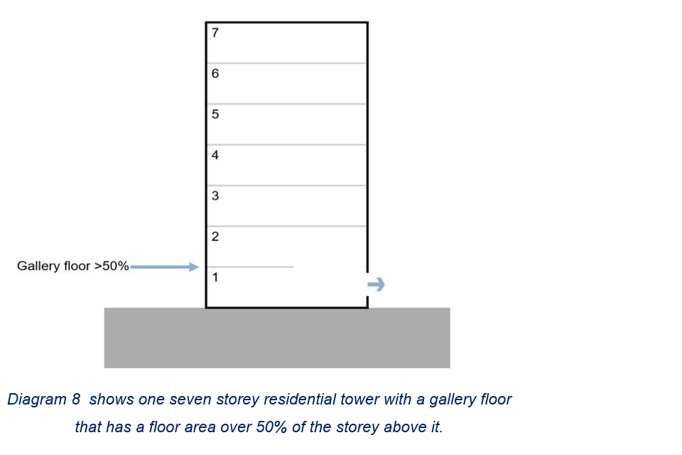Diagram 8 shows one 7-storey residential tower with a gallery floor that has a floor area over 50% of the storey above it.