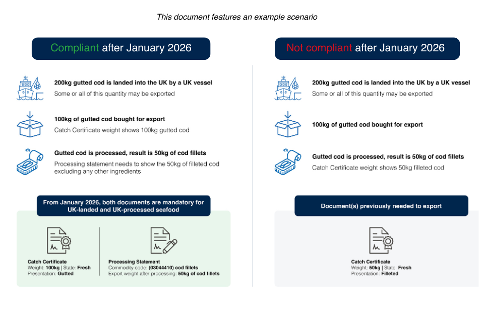 From January 2026, if the fish was landed in the UK and processed after landing in the UK, the consignment must be accompanied by a catch certificate for the landed weight that is being exported AND a processing statement referencing that catch certificate.