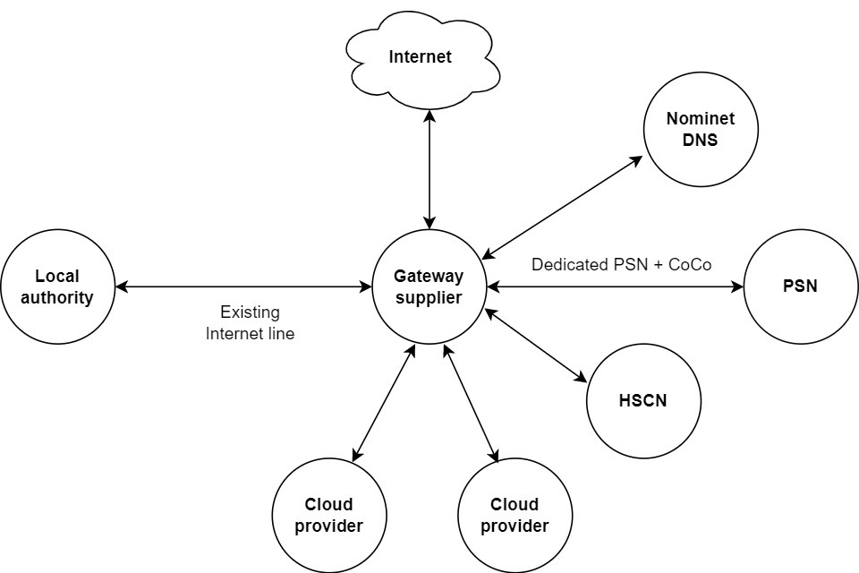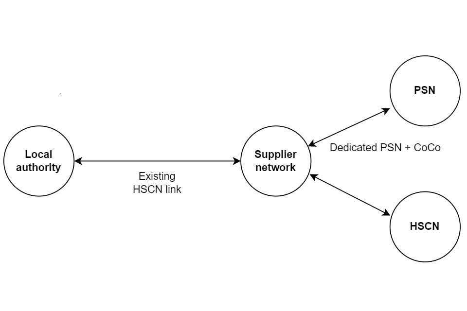 This option is good for PSN users who already have an existing connection, for example the Health and Social Care Network (HSCN). The existing network connection is used to carry all PSN traffic as well, which is split once it reaches the supplier.
