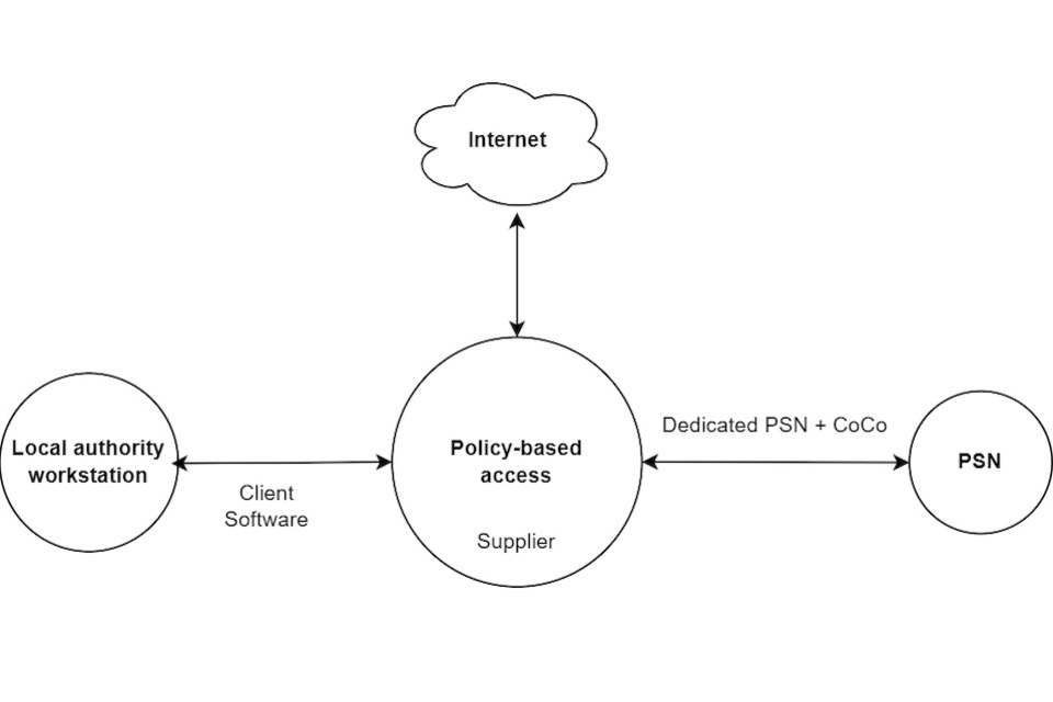 Diagram 3 shows the supplier has policies to route traffic to different destinations. For example, to the local authority workstation via client software, to the PSN via a dedicated line or to the internet.